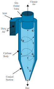 سیکلون با استفاده از عمل و جریان سیکلونی ذرات غبار را از جریان گاز جدا می کند. در یک سیکلون معمولی، جریان هوا حاوی غبار با زاویه ای مشخص وارد سیکلون شده و به سرعت چرخانده می شود.